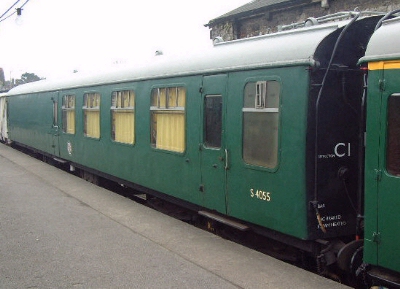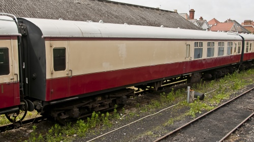 P 1989 by SST, at Andover till 1992. Extensive conversion to Bar Car: bar counter, with large sitting/circulation area. External windows blanked behind Bar itself. Bar Car for Wessex Belle wine and dine set. Steam heating fitted for 2001. Moved from Swanage to Midsomr Norton 02/26. |