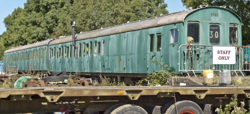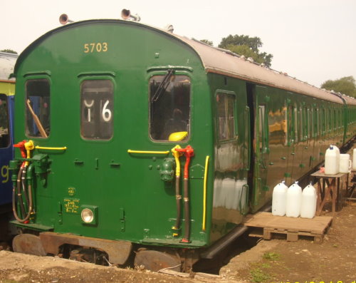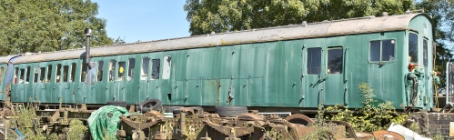 750v 3 rail: DMBSO of 2-EPB Unit 5703 (later Class 416/2). Eventually (as 977874) with 65304 (as 977875) made up Departmental Unit 930214, used as Sandite/de-icing train. With 65382 (qv) and two similar vehicles from Selhurst Depot to the former station at Finmere (disused GCR station between Brackley and Quainton Road) by 09/09 - private site: no unauthorised access. By 03/20: moved from Finmere to 'D' Site, Graven Hill, Ambrosden, Bicester for storage. 10/22: moved to Nemesis Rail, Burton upon Trent. 02/25: confirmed still in situ. |