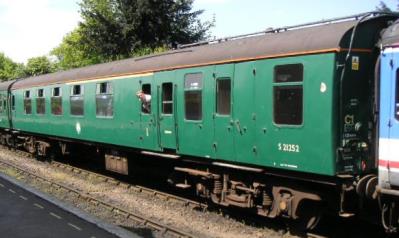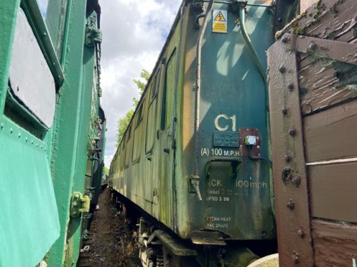 P 1982 with damage. Commonwealth bogies. Built for Eastern Region. BR(S) Green livery. Certificated for mainline use. 07/24: stored in Alresford sidings. |