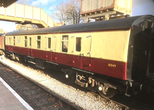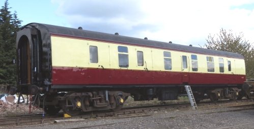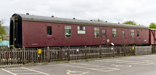 P 2009 ex Old Oak Common. By 01/12 converted to a permanent way mess coach complete with full kitchen. Maroon livery. 04/21: entered works for repaint. 05/21: outshopped in BR crimson lake and cream livery. |
