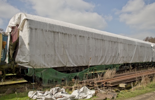 P 1994 from storage at Old Oak Common. Plans to rebuild compartment bulkheads and parts being collected to restore to original - these had been repositioned during conversion to Departmental use. Good authenticity as Departmental vehicle. Sheeted. 05/25: confirmed still in situ. |