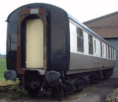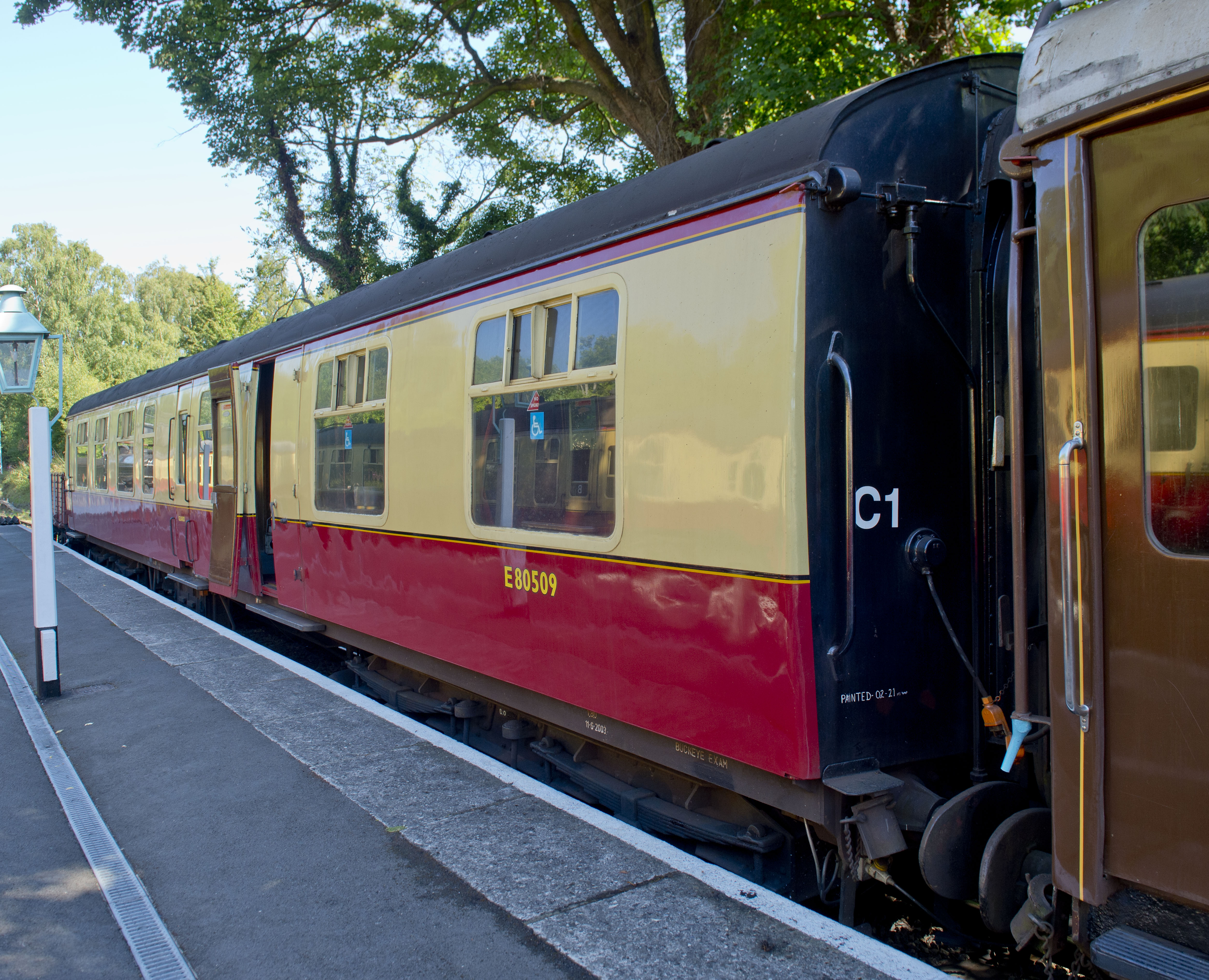 P 1989, Llangollen: but noted 10/99 as to NYMR for conversion and use as accessible carriage. Professionally restored at Cranmore by end of 2003; some teething problems resolved before going into service; Chocolate & Cream livery at that stage - see additional photo below. BR crimson lake and cream livery by 2019. |