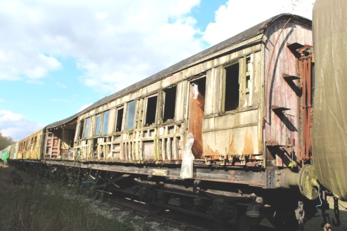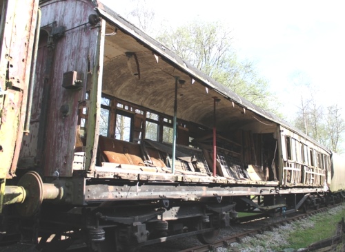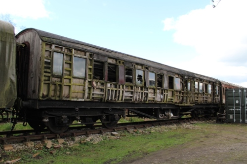 Converted to Ambulance Ward Car c1939, captured 1940 by German forces in France; recaptured 1945. P 1970 Longmoor; Eastleigh 1971-3; Cranmore. National Army Museum 1990: MoDAD storage 1991. By 06/07 body deteriorated further, sheeted over. To Rowsley (Peak Rail) by 09/11, eventual restoration to Ambulance Car conditon is planned (albeit in LMS livery) - will then have two wheelchair-accessible saloons. In meantime, selected non-original parts will be removed for use elsewhere and this coach will be used as interior parts store during restoration of 7991. NOTE - there is some doubt about the number sequence for this vehicle. 05/25: confirmed still in situ. |
