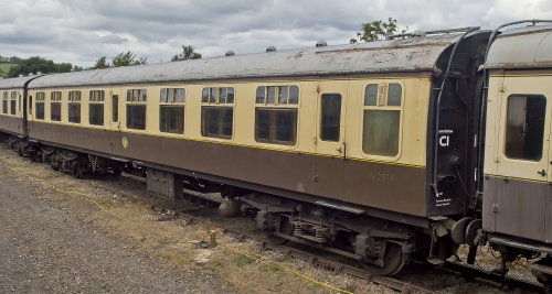 P 1983 at DVR: to GWSR 1985. Refurbished 5/03. Forms part of the Carmine/Cream passenger rake. Lot 30349 is unique in having single-bolster bogies. Repair and repaint (to BR(W) Chocolate and Cream) completed 12/13: now running in Gloucs Warks 'Rake 1'. |