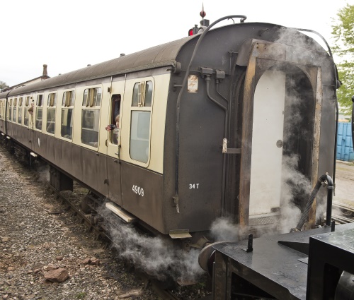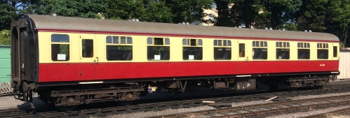 P 2003. Built for WR with Commonwealth bogies. To SR 1973: changed to B1s, then B4s. To Carriage & Traction Co 1994. Stored Ferme Park: in InterCity livery. To WSR 2003 (9/00?) - overhauled and repainted into BR(W) Chocolate & Cream livery. By 07/18: repainted into BR Crimson lake and Cream livery. |