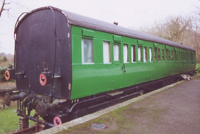 Latterly breakdown train Staff Coach. W 1957. P 1986. At former Horsebridge Station on isolated section of track. Best maintained of the surviving Ironclads: but very little of passenger interior survived Departmental conversion. Used as overflow guest accommodation. 05/18: additional photo below confirms current condition. |