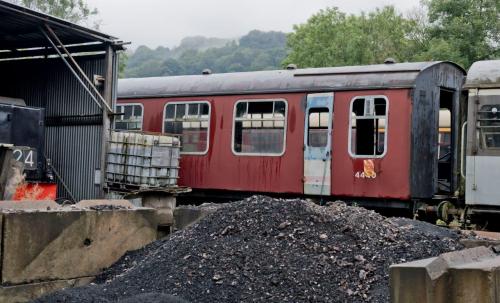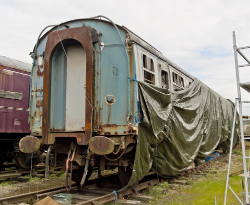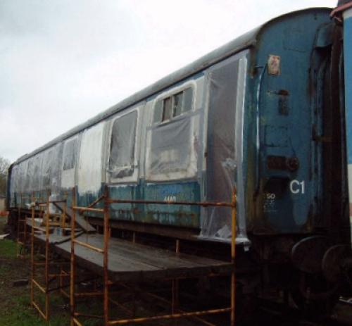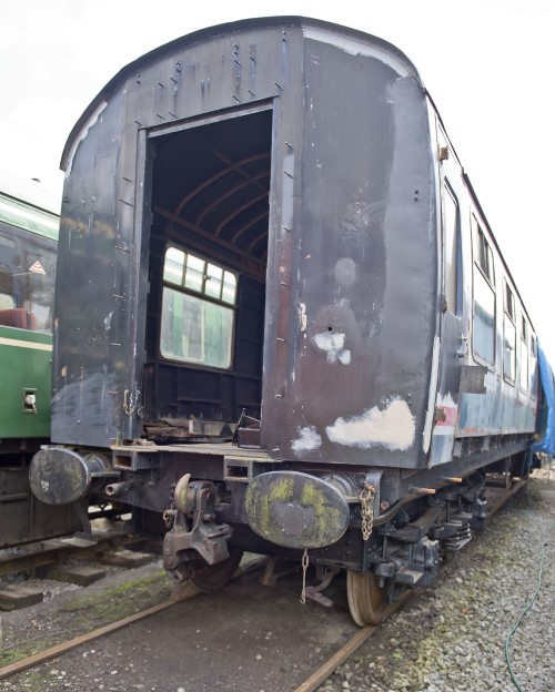 From 1984, Train Crew Training Coach (no modifications). BR rail blue and pearl grey P 1990 by Gloucestershire Warwickshire Railway. By 11/08 work in progress to convert into a Griddle and Bar - involved changes to window arrangement and a complete floor replacement. Noted as a long term project. Sheeted on at least one side by 07/14 - and still so in 04/17 (see first additional photo below). 10/17: moved to Ecclesbourne Valley Railway on behalf of a private owner, and restoration work has begun there (see second additional photo below). 09/24: restoration still in progress. |