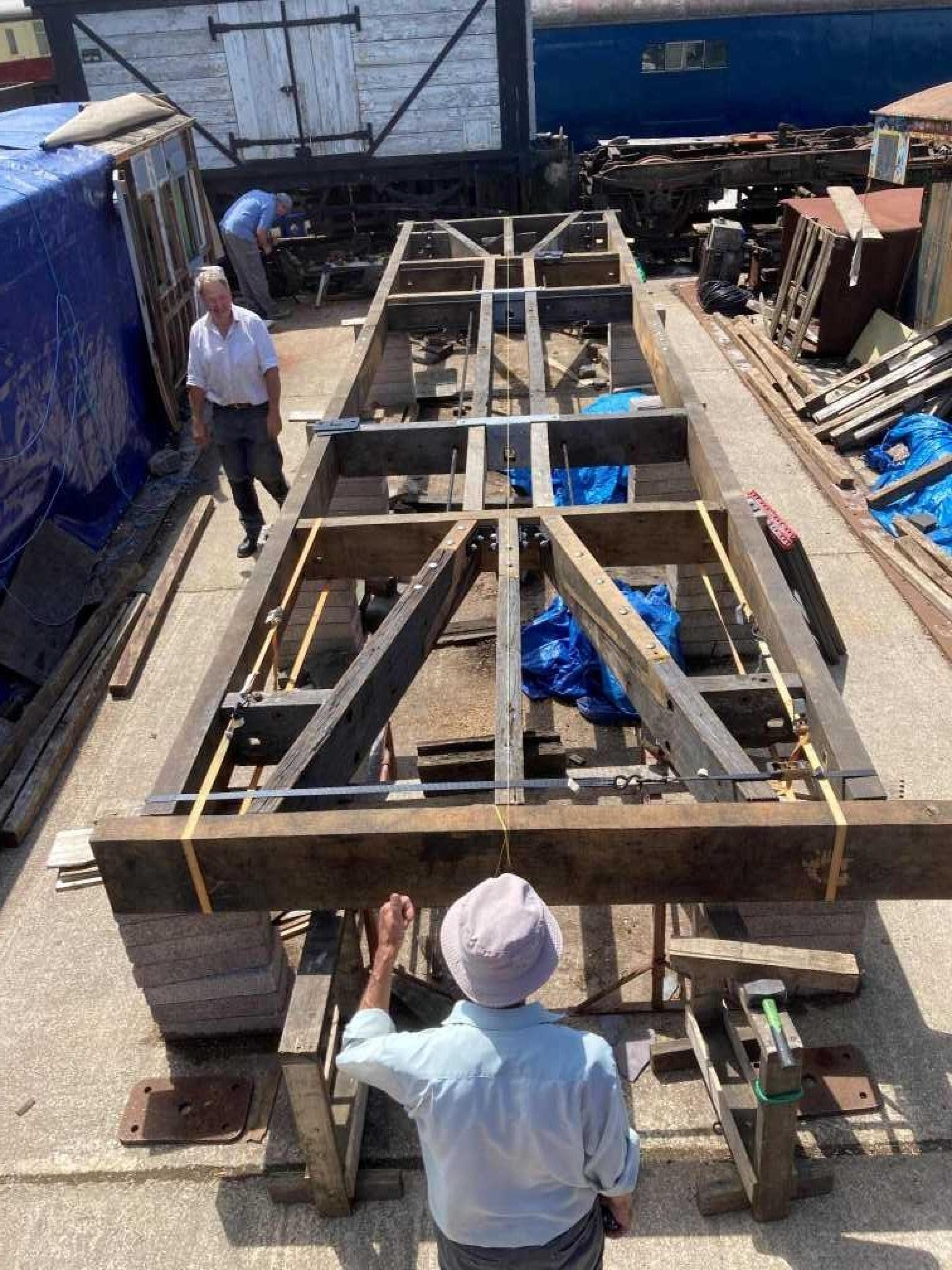 Chassis from Midland Railway six-wheel carriage built between 1884 and 1895. Re-bodied in 1930 as a covered carriage truck (CCT) No 35239 to diagram D1872 in lot 532. P 1982. Ex Granville Colliery, Donnington. At Telford Steam Railway still in ex-Departmental unrestored condition 10/03. No buffers. By 05/23: body dismantled at Telford and chassis acquired by East Somerset Railway for future project. Wooden chassis found to be in poor condition when received and much rebuilding has taken place. Metalwork now being installed and new buffers being made. Springs all renewed. 08/25: plan now is to mount MR 1574 (qv) on this underframe. |