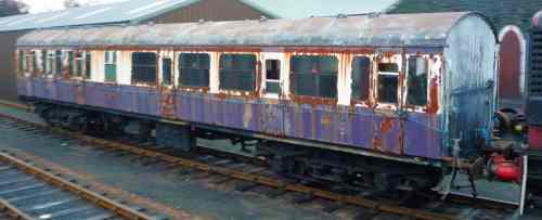 Awaiting overhaul. In much poorer condition than BS43349 - no doors fit (swollen by damp). Urgently needs rescue to a covered building - will then dry out! An interesting vehicle. In Strathspey colours. 5 2nd Compartments (+ toilet), 3 1st (+ toilet). 11/14 offered for sale. 05/17: still in situ and partially sheeted (from 2016) - see additional photo. 07/25: moved from Strathspey Railway to East Anglian Railway Museum for restoration. |