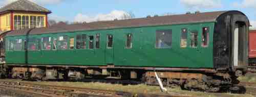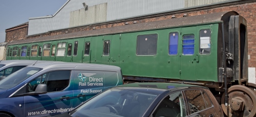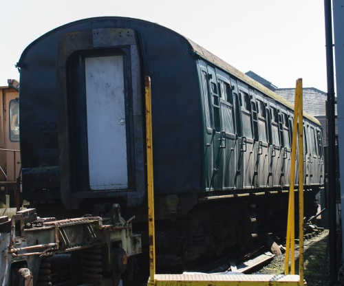 Ex 4-VEP Unit 7799 (later 4-VOP Unit 3918). To Barrow Hill by 12/13 for eventual spares recovery for the Brighton Belle project. Then given a coat of green paint to 'spruce up' this coach for use as an office outside the Rampart shed at Barrow Hill. Number not painted on but visible under the paint. |