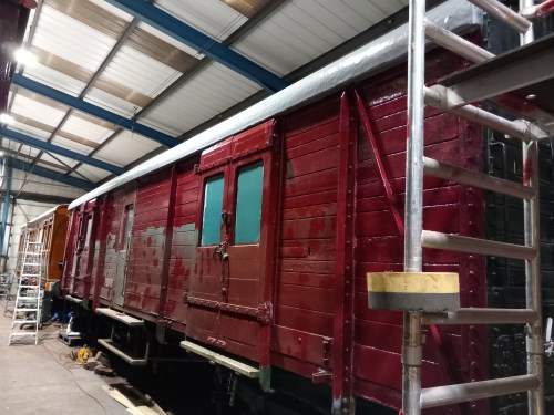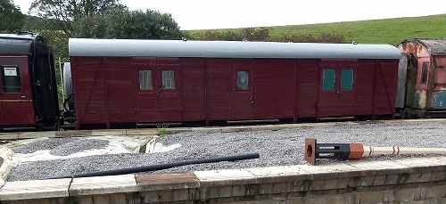 P 1978. Brake version of CCT, of which few survive. Generator, electrics, battery box missing. Restoration into original Southern Railway dark green almost complete when seen 08/05). Dark green livery refreshed by 06/13. 09/23: reroofed and repainted in BR maroon livery; change of owner; awaiting further work to restore some original features such as battery boxes. 08/24: moved from Embsay and Bolton Abbey Railway to Kirkby Stephen East. To Wensleydale 2025. |