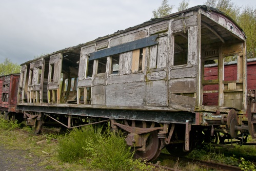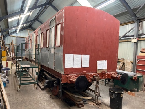 W 4/15. P 8/04 from Langtoft, Driffield, East Yorkshire. '456' clearly visible. In two halves (through luggage compt.) Believed to be identical to 1111 on NYMR. By 05/14: Now on unidentified PMV underframe. By 09/18: early stages of restoration under way. 08/22 and 08/24: restoration progress shown in main and additional photos. |