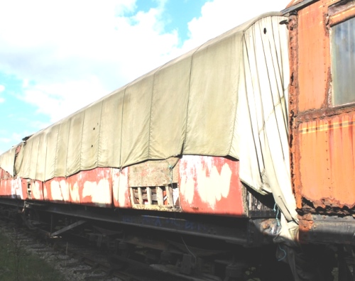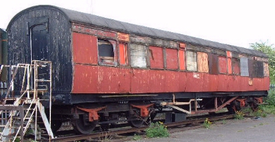 P 1984 by BR(LMR) Staff Association, Aylesbury Station. Was reported as becoming derelict and a possible source of components for other LMS Period 1 stock - but moved 07/06 to Nottingham Heritage Centre, where sheeted. 06/09: to Peak Rail. 04/17: still present and partially sheeted - see additional photo. 05/25: confirmed still in situ. |