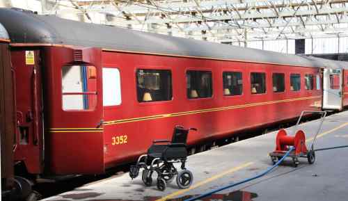 Part of Blue Pullman Mk 2 set (Mk 1 buffet cars), first passenger trip 1/06. Nanking Blue and white livery. East Ham Depot. Purchased by Cotswold Rail from FM Rail 1/07. Then at East Ham until sold to WCRC and to Carnforth 11/09. Repainated into West Coast Railways Maroon by 12/09. 02/20: confirmed still at Carnforth. |