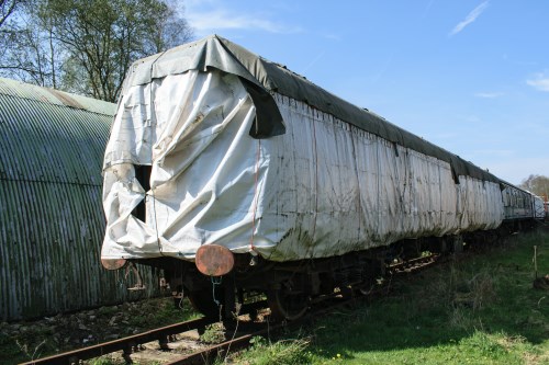 P 1989. West Highland Line livery. Some preliminary restoration started from 2005. Sheeted by 5/08. 04/17: still present and sheeted. 05/25: confirmed still in situ. |