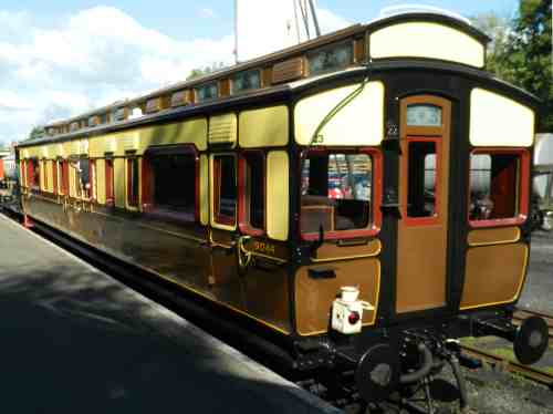 Clerestory: believed to have been used by King Edward VII when Prince of Wales: also by the opera singer Madame Patti when travelling from Penwyllte Station (on the Neath and Brecon Railway) - about 1 1/2 miles from her castle home, Craig-y-Nos. P 1964 privately/Dowty RPS; Ashchurch, Toddington 1983; Swindon Works; 6/99 Bream Flour Mill, Forest of Dean: Bodmin 2007. Interior dismantled following mishap at Ashchurch. Recent major cleaning has revealed a quality wooden floor in chequerboard pattern. Believed to be the oldest surviving GWR bogie carriage. Full restoration completed and back into service 10/13. |
