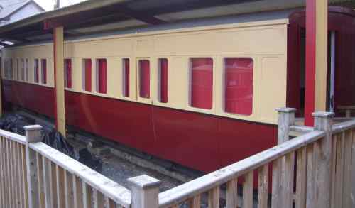After withdrawal used as mobile home at Gartan, Co Donegal. Then Cumann Traenach na Gaeltachta Láir (Central Gaeltacht Railway Society) Booking Office: at Fintown till to Old Station House, Donegal. Photo below shows condition as at 10/01. By 06/14 rebuilt with another half coach to form the complete coach as seen above. Information about the second half-coach would be welcome! |