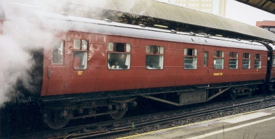 Class B5 dining car: ordered by LMS Northern Counties Committee but not built until 1950 by Ulster Transport Authority in Dunmurry bus workshops. P 1979. Bar Car for RPSI Northern operating rake - bar area modified for the purpose. |