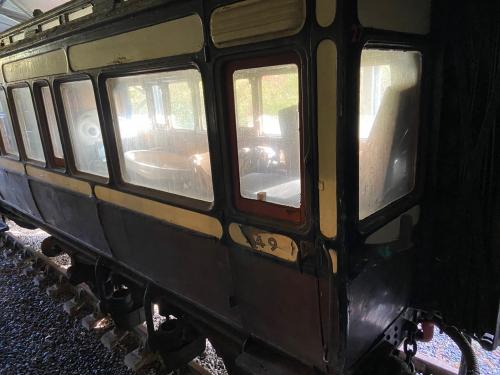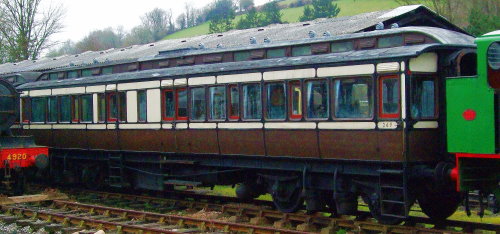 Family Saloon, converted to GWR Directors' Saloon pre-1907. Rebuilt as DE's Saloon (Plymouth District) in 1940. W 1963, P privately 1965, resold 1992. Used in Queen Victoria's Royal Train 1897?? Original etched glass in clerestory. New (non authentic) seating. Newer photo (02/13) photo below. |
