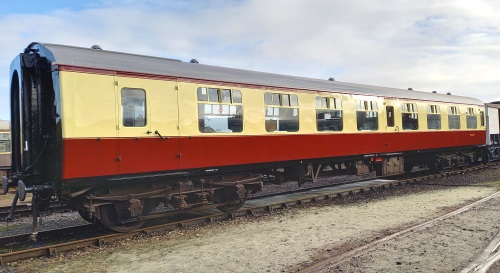 P 1991, reportedly for Llangollen but delivered to Gloucestershire Warwickshire Railway. Refurbished and repainted 09/02 to form part of the BR crimson and cream livery passenger rake. B1 bogies. 01/13: further extensive work completed: this included modification for disabled use - toilets removed to form a large vestibule, double doors fitted, some seating modification; also repainted into BR(W) Chocolate and Cream livery. 10/24: outshopped in BR crimson lake and cream livery. |