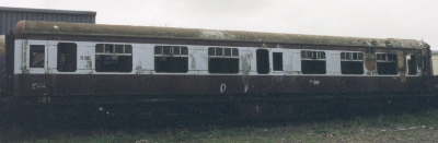 Class J16 carriage. Built to Northern Counties Committee design for 'The Festival' express, rebuilt as UTA railcar trailer No. 532 in April 1959. At Whitehead, burnt at one end and derelict. Scrapped (with underframe on which it was resting) by 08/04. |