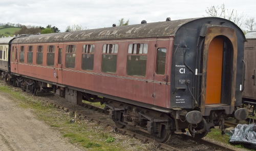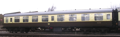 P 1991 for Llangollen, but promptly resold to GWSR. Refurbished 3/05. Fitted with full sized replacement tables. B1 bogies. Awaiting repair when seen 10/15 and 04/17. 03/18: refurbished and repainted (from BR Maroon to BR(W) Chocolate and Cream livery) to provide additional capacity for the line's extension to Broadway. 03/24: interior upgrade and other repairs in progress. |