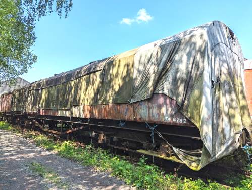LMS version of Midland design. 57 foot. No 1272 carried from 1933. P 1971 - used as dormitory for volunteers on Bluebell. Arrived Butterley 12/93. By 08/06 partially sheeted and awaiting future restoration. 05/23: confirmed still at Midland Railway Centre (sheeted at Swanwick Junction). |
