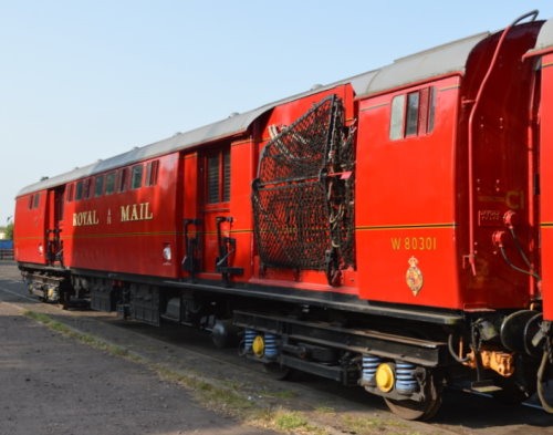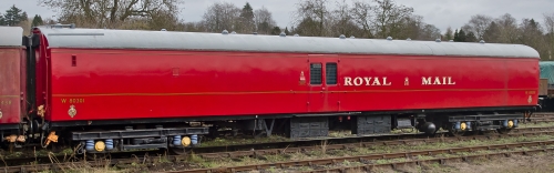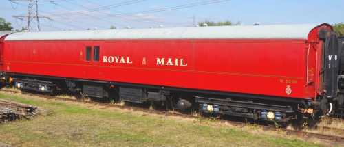 2nd BR built PO Sorter. P 1998 by RVP members. B5 bogies. ETH fitted, steam heat, mail exchange equipment, some minor interior items removed. 2002 Repainted into original livery. 2006-7 traductor arm and catching net fitted and operational. Some minor internal work outstanding. By 09/16: at Burton upon Trent (Nemesis Rail) for overhaul following collision. By 12/16: returned to Great Central Railway following repairs. 10/25: refurbishment in progress. |
