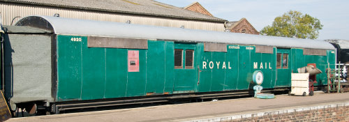 Used in 1960s on Waterloo - Dorchester South mail service. P 1977, stored till 1978. NRM till ownership to NVR 4/05. Not unique - is also 4922 on Bluebell. In BR(S) green livery. Interior under long-term restoration. Modern lighting, some display cases, otherwise as was - except sorting rack destinations now East Anglian! By 04/17: now sheeted - see additional photo below. |