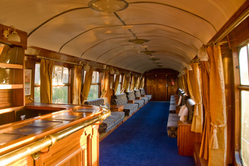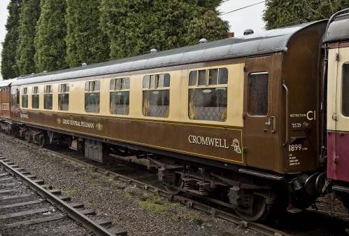 P 1988 Steamtown. To GCR until 1990. Conversion project to Bar Car/First Class Lounge Car abandoned 1999. For Sale by 01/04, but GCR advise, not at risk. Then stored OOU at Swithland. Reported 01/10 to be upgraded (featuring a lounge area). By 12/10: refurbished as Bar Car '1899' in pseudo-Pullman livery for GCR's Pullman-style dining train - see photo of interior (below). 09/20: still in operational use in GCR dining train. By 09/23: renamed KATIE-MAY. 08/25: repainting into BR maroon livery completed. |