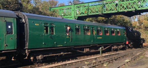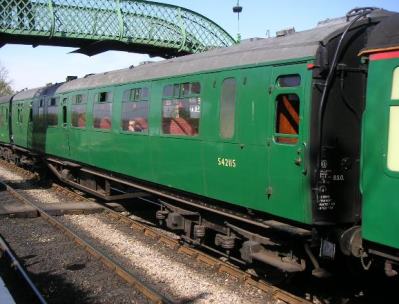 1 of only 2 with a coupe compartment. Compartments removed on Departmental conversion. BR Mk 1 bits used to install separate Guard's compt. Seats ex 4367. Wheelchair access to saloon. Returned to service 2/05 after complete overhaul. SR Green livery. By 05/13 undergoing full restoration at Ropley Carriage Works: includes new panelling, wiring and floors and replacement timber (still under way 07/15 - see main photo). By 10/18: back in operational use. |