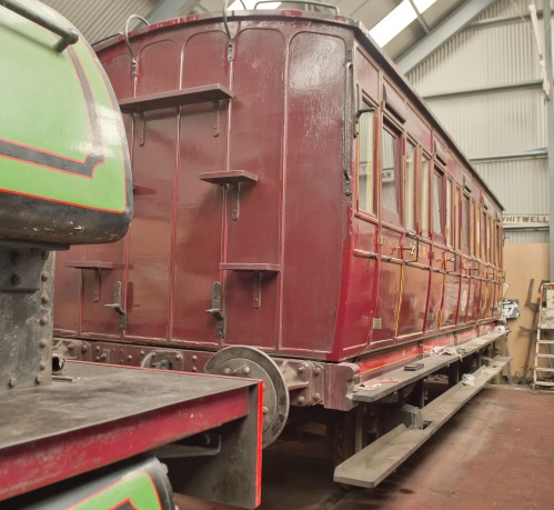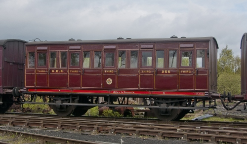 Date approx. Sold out of service ca 1909. Became part of bungalow at Acaster, near York. To Tanfield ca 1990. Tanfield ref 0083. Restored 1993 on underframe from SR PMVY 1291 (qv). '256' found on a door - 04/07; repainted in NER red livery to reflect this. 05/22: repainted - still in NER red livery. |