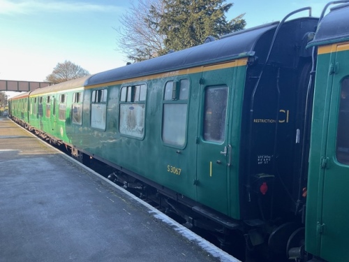 Built for Southern Region. P 1982 Mid Hants Railway. One bay of seating removed for serving station. Used for the 'Watercress Belle' dining train in pseudo Pullman livery. Privately owned by an individual 1988 to 1999, then by the 'Belle Group' (a group of Shareholders). By 01/23: livery changed to BR(S) green. |