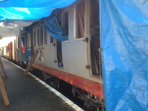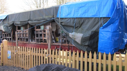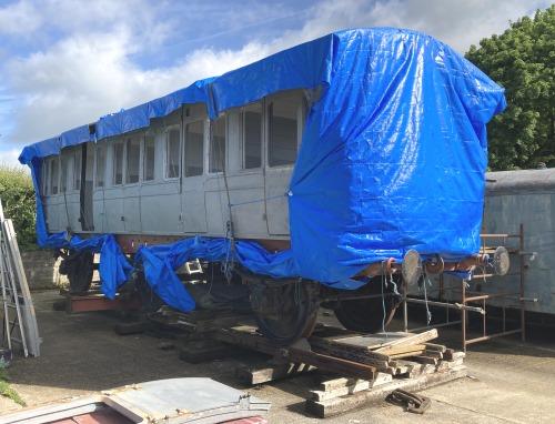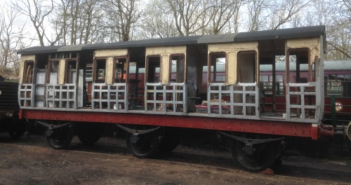 One of 700 built 1886 to 1896 - this one built 1890 (deduced from interior detail). Sold to Brecon & Merthyr Tydfil Junction Railway 1920 (No 112) as one of eight third class carriages of same design. Absorbed by GWR in 1923 (renumbered 4318). Body sold out of service 1925 Became cafe on A30 at Pathfinder Village (west of Exeter) until late 1970s, when it was acquired for a garden shed in Blackford, Somerset. Donated for restoration 2007 and moved to Midsomer Norton. Fully sheeted by 08/09. From 20/12/10: now mounted on chassis from LMS CCT 5012 (body of which had been scrapped - qv), and this chassis has, in turn, also now been identified as being from earlier MR 6-wheel carriage 1753 (qv); it was re-used when 5012 was built in 1932. By 04/18: restoration/rebuild actively under way. 06/20: moved from Midsomer Norton to East Somerset Railway. 03/26: restoration work progresses. |