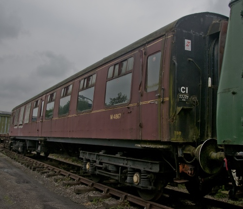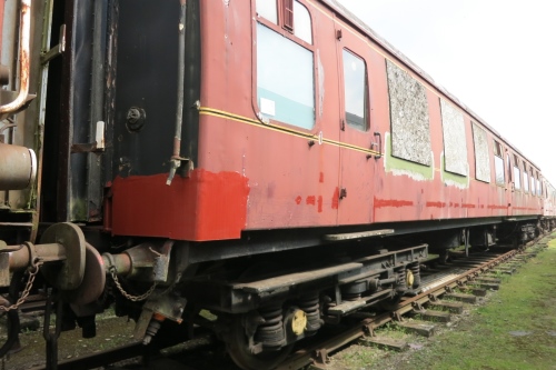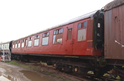 To Quainton 02/1994. B4 bogies. Lot No on plate painted as '39525' in error. 08/11/18: arrived at Toddington, having been acquired by Gloucestershire Warwickshire Railway - first priority to replace several boarded up windows and ensure vehicle is watertight. restoration to full working use will follow in due course. By 12/18: repairs to toilet end, started by previous owner, have been completed to stabilise vehicle's structure (see second additional photo below): now waiting its turn in the restoration queue. |
