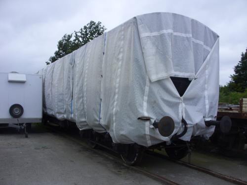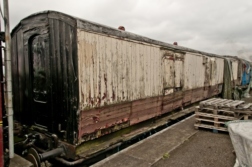 P ca 1968 ex BR Wolverton by L&NW Society. No corridor connections. Originally Mansell wheels. Now located alongside Platform 2 at Brownhills West, Chasewater Valley Railway for some bodywork repairs and a full repaint into maroon/cream. Carries DM01836M on plaque, upper left corner. By 10/15: moved to a private site at Honeybourne Airfield Industrial Estate, near Evesham.. 07/16: now fully sheeted - see additional photo below. 04/22: confirmed still in situ. |
