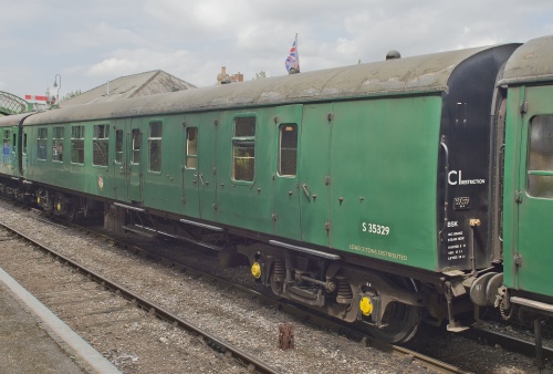 P 1993 by VSOE but promptly swapped. Commonwealth bogies. Built for LM Region. Rubber mounted glazing, aluminium passenger doors, partial Formica interior, dual heated. Refurbished by Mid Hants Railway 1997. Certificated for mainline use. By 06/09 painted red with fictitious departmental number DS 329. By 2011: in BR(S) green livery. |