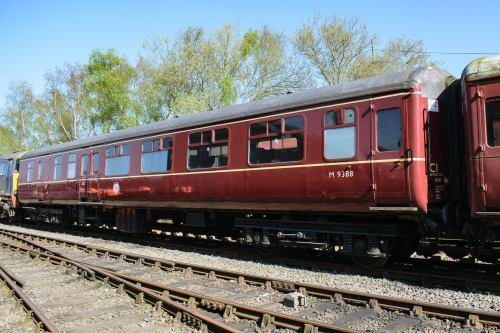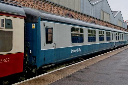 To Barrow Hill by 03/02. Was formerly named 'Bailechaul'. As with the other Barrow Hill operational coaches, BR Maroon one side and BR Rail Blue and Pearl Grey livery on the other side. |