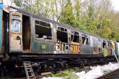 W 1966 and to Army at Long Marston as inspection saloon. P 1992; heavily vandalised. Seating to 4211 (qv). Restoration at Alresford from 01/02 - chassis now complete, window end re-built as corridor. Much new panelling. Seating to come from 4-SUB 4732. Sheeted by 09/14. |