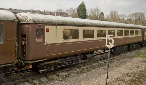 Mk 2f loco-hauled stock converted to Class 488/3 Gatwick Express Trailer First Handbrake (TFH) - ran as part of Set 8309. To Ecclesbourne Valley Railway, Wirksworth by 03/03 and underwent restoration as refreshment/hospitality vehicle. Repainted in pseudo-Pullman livery in 2012. By 10/14 in use as such. 01/22: advertised for sale. By 12/22: moved to Miles From Nowhere Club, Long Lane, Shipley Gate, Derbyshire, NG16 3JE. 02/25: still on site (disused) - site owner is now wedding business Ensarb Estates Ltd, Whistle Barns. |