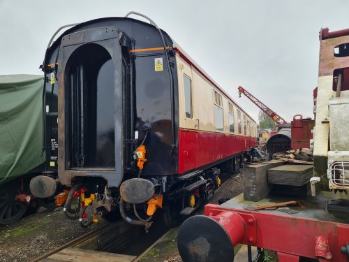 Design code AB101. C.1995: with Flying Scotsman Railways, latterly Rail Charter Services - painted into the WCJS lined purple lake livery - based at Bounds Green. During 1998: painted into blue/gey livery. During 2001: painted into SR Green livery. 2004: moved to Old Oak Common when acquired by EWS (with bulk of Rail Charter Services rolling stock). 2007: acquired by Riviera Trains. 2009: painted crimson lake and cream. 2010: transferred to Eastleigh Depot. 06/13: now based at Tyseley as support coach for 4936 'Kinlet Hall' - and, as such, travelled extensively: e.g. 10/13 was at the Severn Valley Railway; 05/16 at West Somerset. By 12/17: at South Devon Railway and no longer 4936 support coach. Date unknown: moved from South Devon Railway to Tyseley. 11/21: moved from Tyseley to Rampart Engineering at Barrow Hill, having been acquired by the BR Class 8 Steam Locomotive Trust for use as the support coach for 71000 'Duke of Gloucester'. 05/22: returned to Tyseley following completion of overhaul by Rampart Engineering. 01/24: internal fit-out in progress, in preparation for use as 71000 'Duke of Gloucester' support coach. By 12/25: now in use as 71000 'Duke of Gloucester' support coach. |
