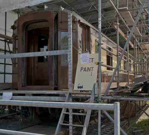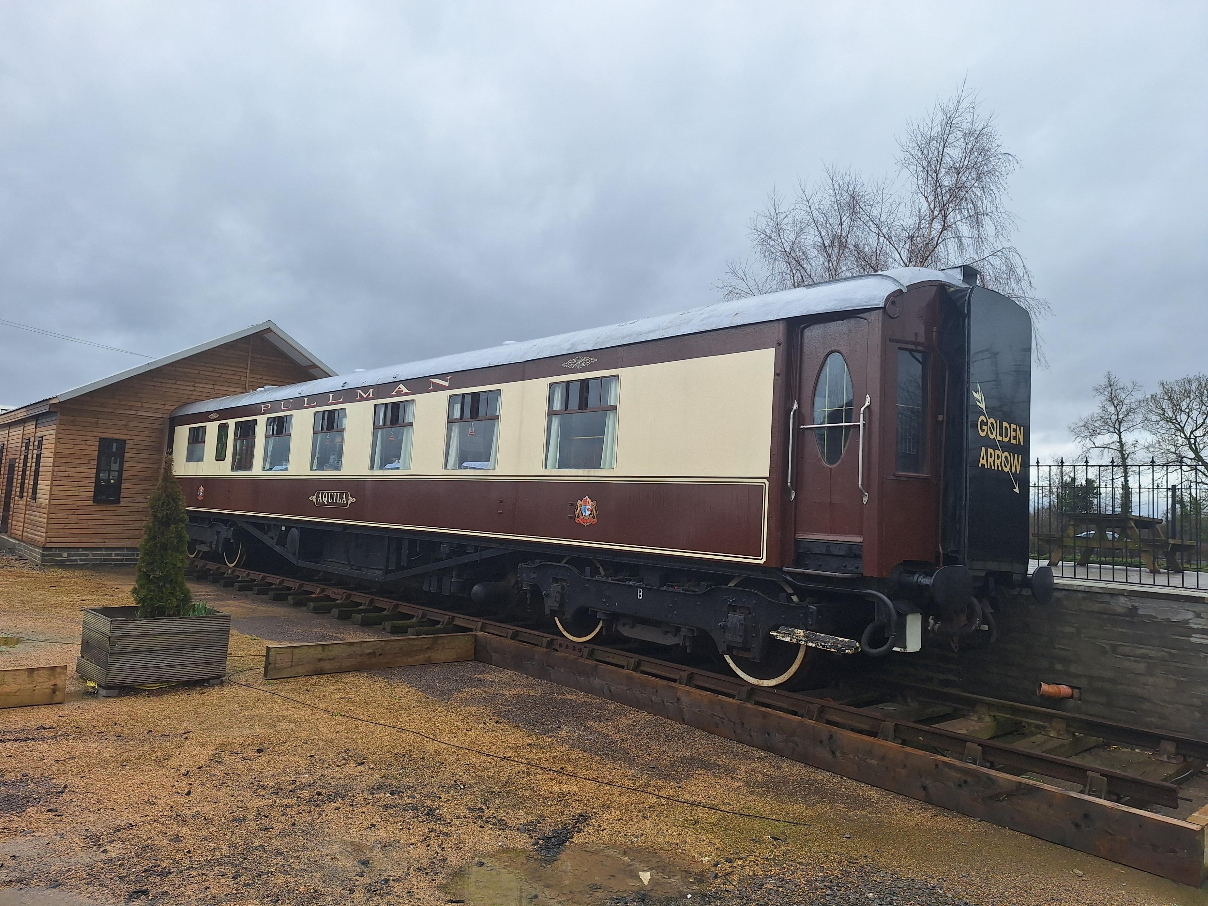 Car U. Built for the Festival of Britain in 1951 and used on 'Golden Arrow' service. Used by HM The Queen on a number of occasions, including March 1958 on a journey to Windsor. P 1968 by Bulmers and at Hereford until. Sold to VSOE 1986, Swindon until 1987, then Stewarts Lane. Resold 1988 to Colne Valley Railway, but not moved until 1989. Under extensive renovation when seen 08/13 (see additional photo below). 08/19: offered for sale. 11/19: moved from Colne Valley Railway to South Devon Railway, having been bought privately - in the new carriage shed at Buckfastleigh awaiting turn in the workshop (missing interior fittings - being sought). 05/21: moved from South Devon Railway to Bluebell Railway. 08/23: offered for sale, following a review of the Bluebell's Pullman fleet and the future development of its Golden Arrow Pullman Train. Moved to Garden Park Garden Centre, Hewish, North Somerset |