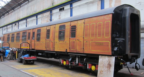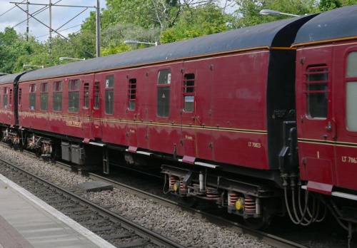Dgm AB202. Converted to electric stock York 1966 for 4-TC Class 491 (later Class 438) for Waterloo to Weymouth line, running with Class 33 diesels or 73 Electro-Diesel or Class 430 4-REP units. To LT for excursion use on Metropolitan line. OOU since 2003. Seen at Eastleigh Works 05/12 but by 09/12 back to TransPlant Ltd/London Underground at West Ruislip Depot. By 09/17: new livery; central door locking mechanisms added (see sloped attachments on the bottom of each door above the step plate). |